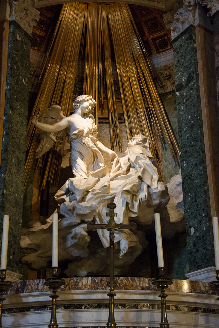 Täältä löydät Berninin upean veistoksen Pyhän Teresan hurmiosta (1652). Veistos esittää espanjalaista karmeliittanunnaa ja pyhimystä Ávilan Teresaa, joka on saavuttanut meditatiivisen hurmostilan. Enkeli on juuri lävistämässä Teresan sydäntä jumalallisen rakkauden nuolella. Tarinan ulkopuolella on maallisempiakin tulkintoja Teresan hurmiosta ja sen synnystä. Katsoja tulkitkoon itse. Berninillä on kuitenkin hyppysissään ollut uskomaton taito taivuttaa hengetöntä kiveä eläviksi hahmoiksi.